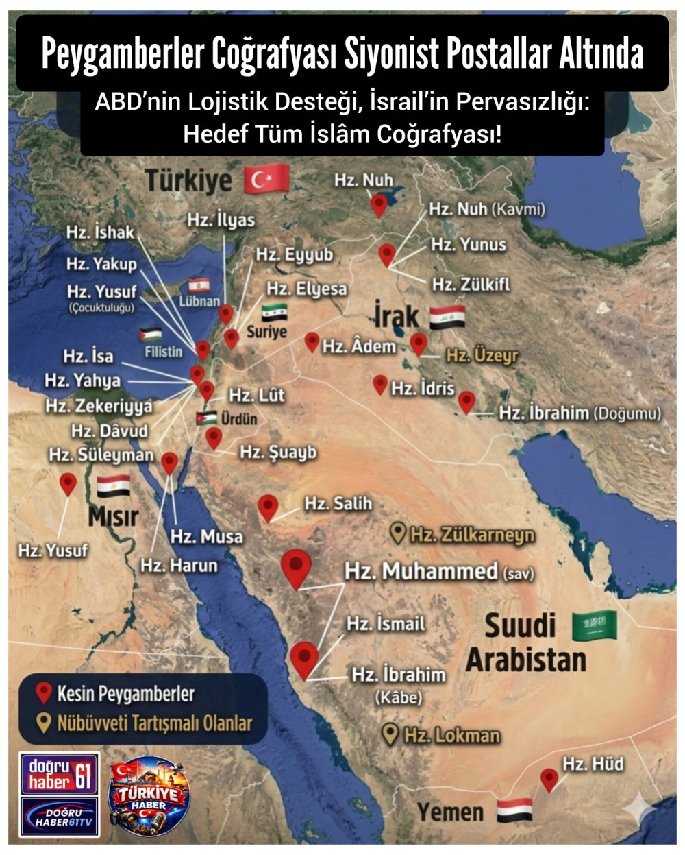 • Siyonizm ve Filistin: Haritanın tam kalbinde yer alan Hz. İsa, Hz. Davud ve Hz. Süleyman’ın yurdu Filistin, bugün siyonizmin genişleme politikası (Arz-ı Mev'ûd ideali) nedeniyle bir açık hava hapishanesine ve soykırım alanına dönüştü.